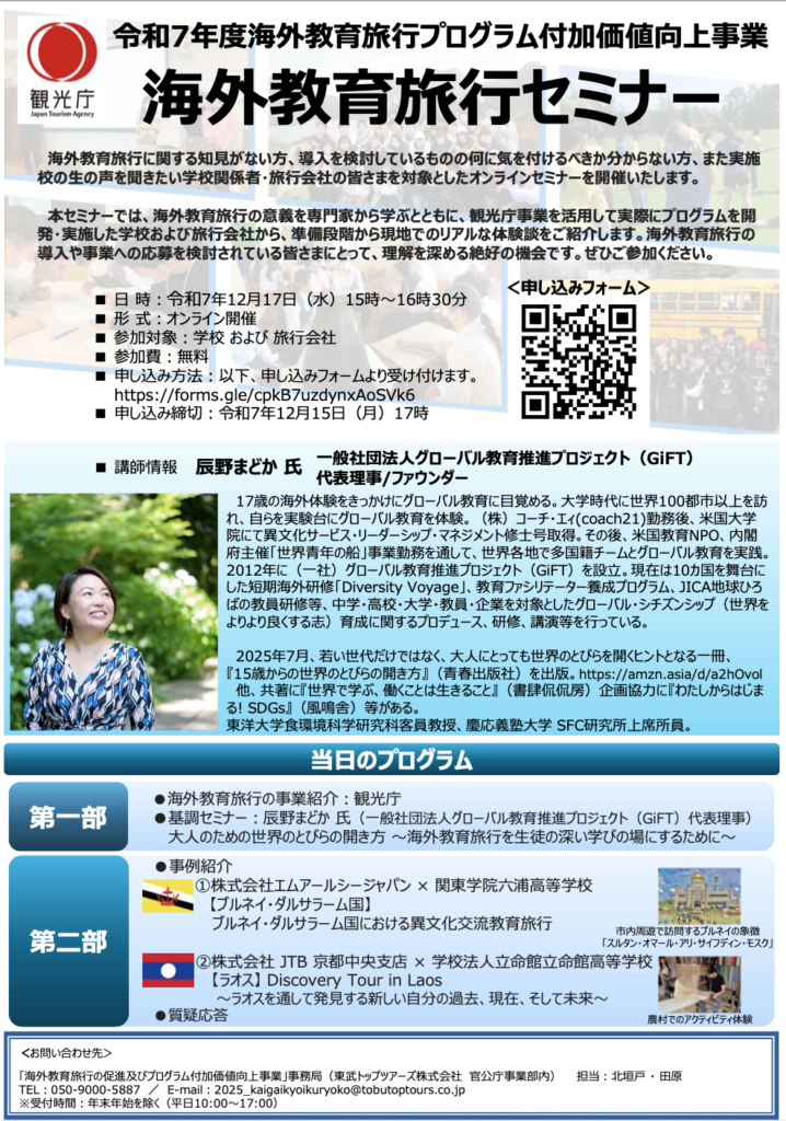 12月17日開催の観光庁主催「海外教育旅行セミナー」にて、GiFT代表理事の辰野まどかが基調講演を行います。