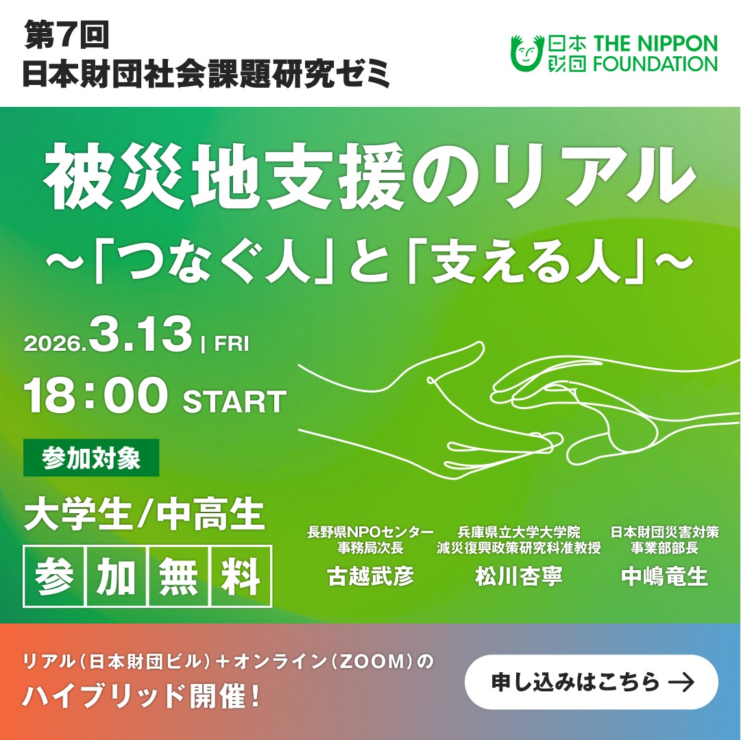 | 開催場所 | 日本財団ビル(東京都港区赤坂1-2-2) / オンライン(Zoom) ※オンライン参加の方は、懇親会のご用意はございません。 |