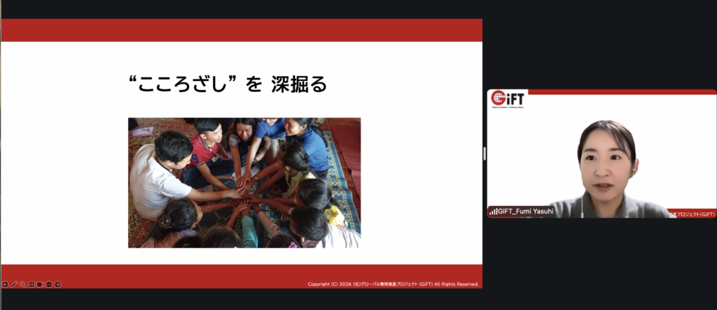 1月のキックオフから3週間ぶりに集まった参加者の皆さんと、第2回では自分の興味・関心がある社会課題の深掘りを行いました。参加者がなぜその社会課題に興味があるのかや、誰を幸せにするために活動をしたいか、などの「こころざし」を引き出すワークをGiFTダイバーシティ・ファシリテーターの安日が担当しました。