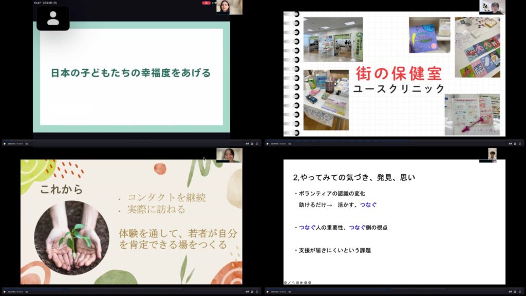 上記のようにさまざまな興味・関心分野をもつ参加者たちは、お互いの発表を聞いて新たな発見があったり、活動の様子に刺激を受けたりして、発表後にはとても前向きなメッセージが飛び交う報告会の時間になりました。