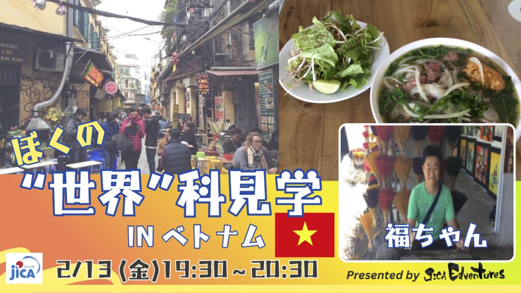 | 2月13日(金)19:30-20:30 ぼくの”世界”科見学 in ベトナム 定員:人数制限なし |